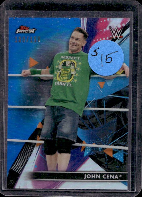 The John Cena 2021 Topps Finest WWE #100 Blue Refractor /150 card is 1 of 19 John Cena's card variations in the 2021 Topps Finest WWE set being tracked by Sports Card Investor, including #117 Base, #100 Base, #100 Refractor, #100 X Fractors, and #100 Green Refractor /99.
