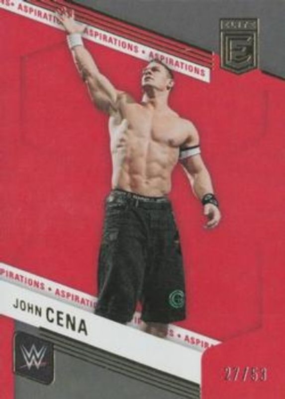 The John Cena 2023 Elite WWE #147 Aspirations /53 card is 1 of 78 John Cena's card variations in the 2023 Elite WWE set being tracked by Sports Card Investor, including Base, Green, Pink, Razzle Dazzle, and Red.