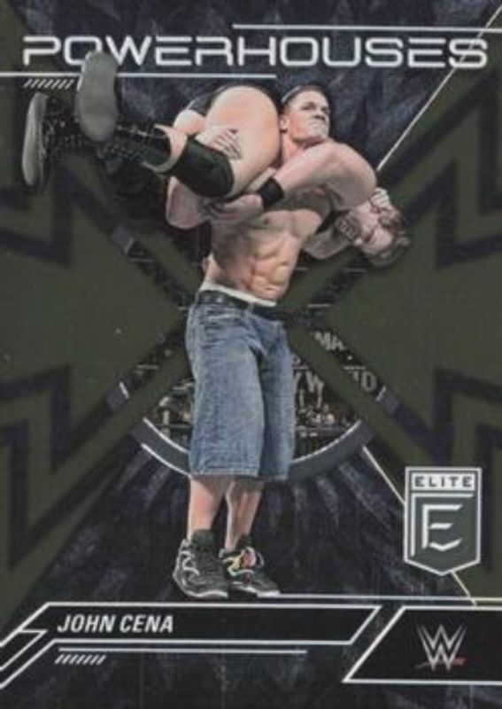 The John Cena 2023 Elite WWE #5 Powerhouses - Gold /10 card is 1 of 78 John Cena's card variations in the 2023 Elite WWE set being tracked by Sports Card Investor, including Base, Green, Pink, Razzle Dazzle, and Red.