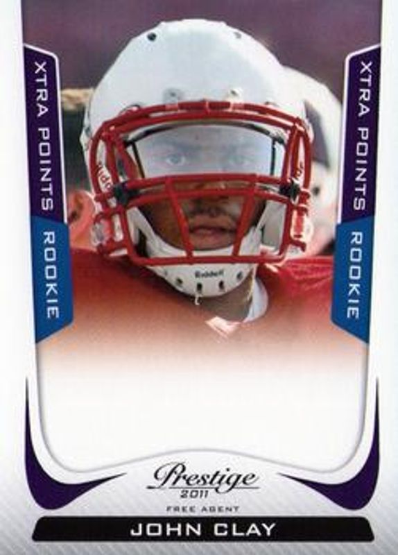 The John Clay 2011 Prestige #252 Xtra Points Purple /50 Rookie card is 1 of 9 John Clay's card variations in the 2011 Prestige set being tracked by Sports Card Investor, including Base, Xtra Points Orange, Xtra Points Gold /250, Xtra Points Red /100, and Xtra Points Green /25.