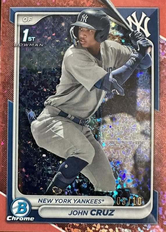 This card is 1 of 55 John Cruz's card variations in the 2024 Bowman set being tracked by Sports Card Investor, including Chrome Prospects (1st), Chrome Prospects - Lunar Glow Refractor (1st), Chrome Prospects - Mini-Diamond Refractor (1st), Chrome Prospects - Pearl Refractor (1st), and Chrome Prospects - Refractor /499 (1st).