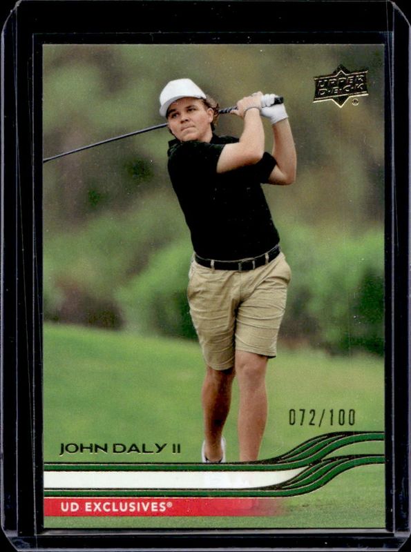The John Daly II 2026 Upper Deck #14 Exclusives /100 card is 1 of 12 John Daly II's card variations in the 2026 Upper Deck set being tracked by Sports Card Investor, including Base, Green, Deluxe /250, High Gloss /10, and Cleared for Launch.