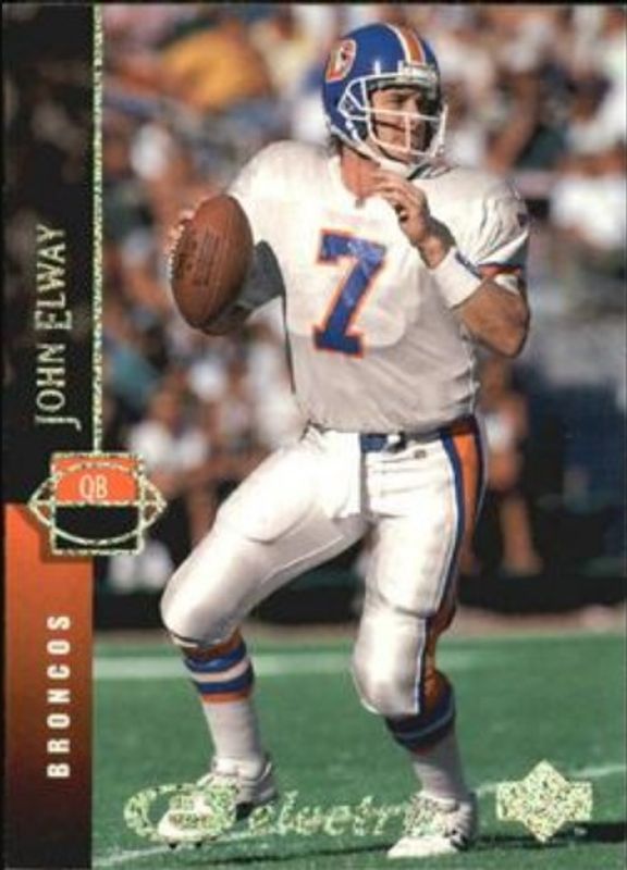 The John Elway 1994 Upper Deck #218 Electric Gold card is 1 of 7 John Elway's card variations in the 1994 Upper Deck set being tracked by Sports Card Investor, including Base, Electric, Predictors Exchange: League Leaders, Predictors: League Leaders, and Pro Bowl.