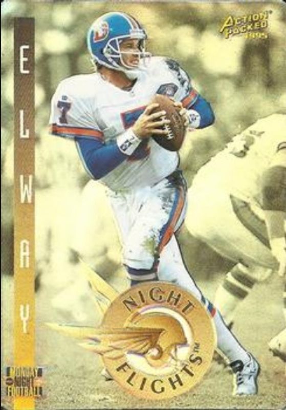 The John Elway 1995 Action Packed Monday Night Football #5 Night Flight card is 1 of 7 John Elway's card variations in the 1995 Action Packed Monday Night Football set being tracked by Sports Card Investor, including #108 Base, #58 Base, #58 Highlights, #108 Highlights, and #8 24K Gold.