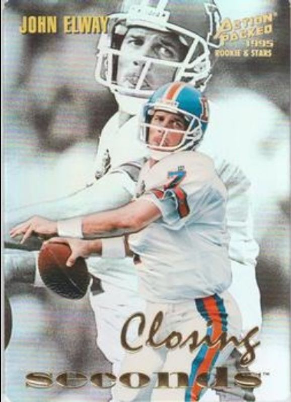 The John Elway 1995 Action Packed Rookies & Stars #9 Closing Seconds card is 1 of 4 John Elway's card variations in the 1995 Action Packed Rookies & Stars set being tracked by Sports Card Investor, including Base, Stargazers, and 24K Gold.