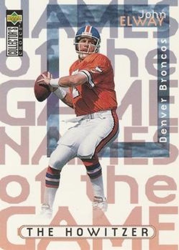 The John Elway 1997 Upper Deck Collector's Choice #52 Base card is 1 of 12 John Elway's card variations in the 1997 Upper Deck Collector's Choice set being tracked by Sports Card Investor, including Base, Memorable Moments, Mini Standee, Play Action Stick Ums, and StarQuest.
