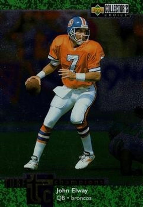 The John Elway 1997 Upper Deck Collector's Choice #TC90 Turf Champions 3x5 card is 1 of 12 John Elway's card variations in the 1997 Upper Deck Collector's Choice set being tracked by Sports Card Investor, including #412 Base, #52 Base, #7 Memorable Moments, #ST5 Mini Standee, and #S17 Play Action Stick Ums.