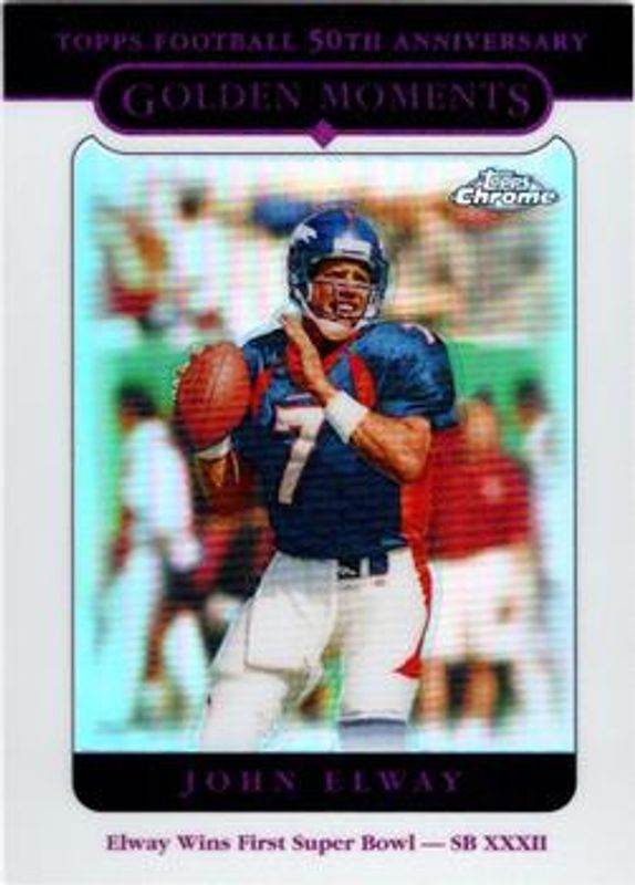 The John Elway 2005 Topps Chrome #157 Refractor card is 1 of 9 John Elway's card variations in the 2005 Topps Chrome set being tracked by Sports Card Investor, including Base, Black Refractor /100, Printing Plate Black /1, Printing Plate Cyan /1, and Printing Plate Magenta /1.