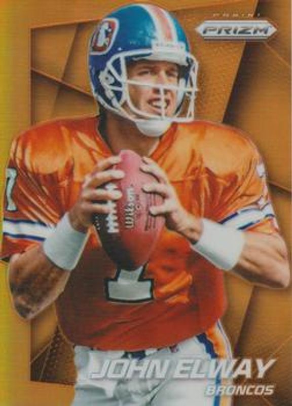 The John Elway 2014 Prizm #41 Orange card is 1 of 19 John Elway's card variations in the 2014 Prizm set being tracked by Sports Card Investor, including Base, Blue, Camo, Green, and Neon Green & Yellow.