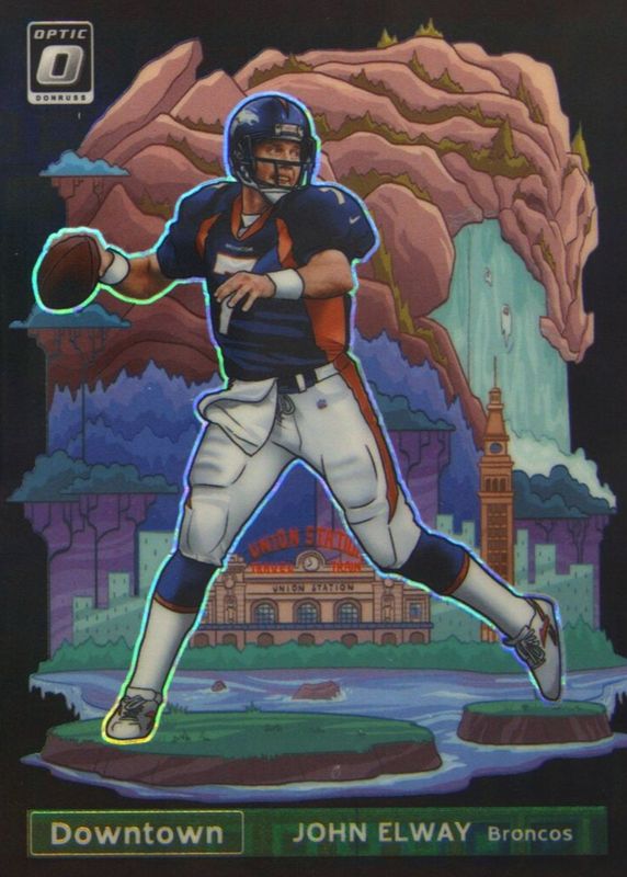 This card is 1 of 10 John Elway's card variations in the 2021 Optic set being tracked by Sports Card Investor, including Downtown /(SSP), Mythical /(SSP), Mythical - Black Pandora /25, Downtown - Gold /10, and Mythical - Gold /10.