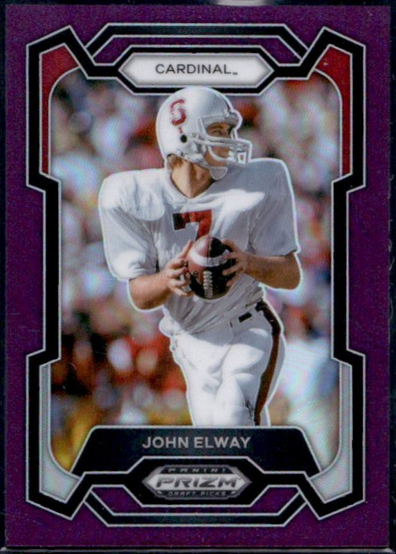 The John Elway 2024 Prizm Draft Picks #37 Purple /75 card is 1 of 63 John Elway's card variations in the 2024 Prizm Draft Picks set being tracked by Sports Card Investor, including Base, Green, Purple Wave, Red Ice, and Ruby Wave.
