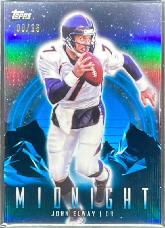 The John Elway 2024 Topps Midnight #30 Moonrise /25 card is 1 of 67 John Elway's card variations in the 2024 Topps Midnight set being tracked by Sports Card Investor, including Base, Moon Beam, Zodiac, Morning /149, and Twilight /99.
