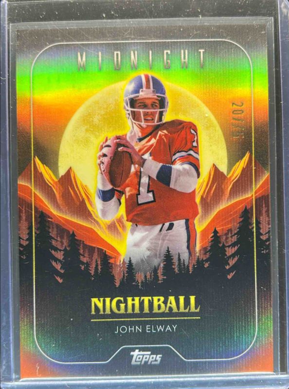 The John Elway 2024 Topps Midnight #NB-21 Nightball - Dusk /75 card is 1 of 67 John Elway's card variations in the 2024 Topps Midnight set being tracked by Sports Card Investor, including Base, Moon Beam, Zodiac, Morning /149, and Twilight /99.