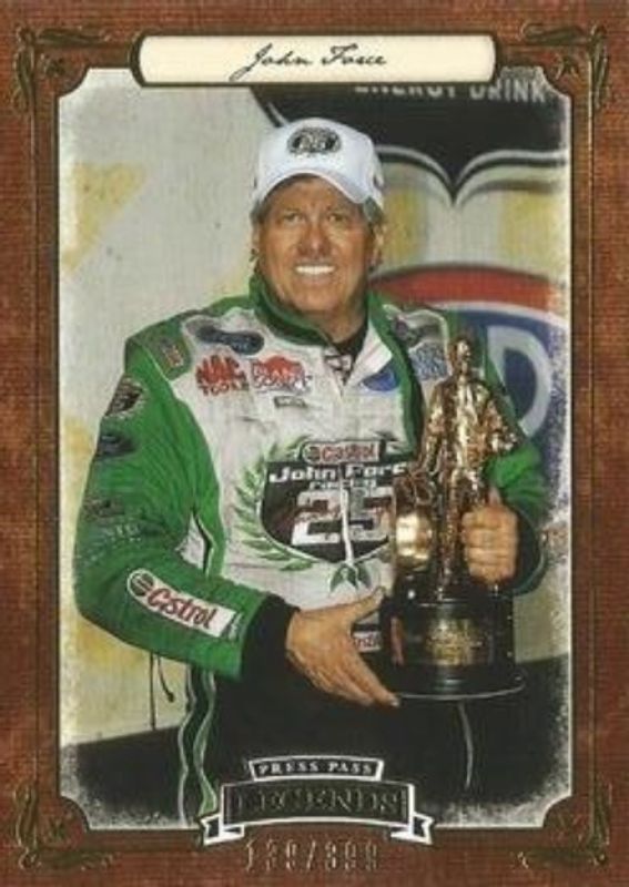 The John Force 2010 Press Pass Legends #13 Gold /399 card is 1 of 40 John Force's card variations in the 2010 Press Pass Legends set being tracked by Sports Card Investor, including Base, Red /199, Holofoil /50, eBay Previews /5, and Press Plates Black /1.