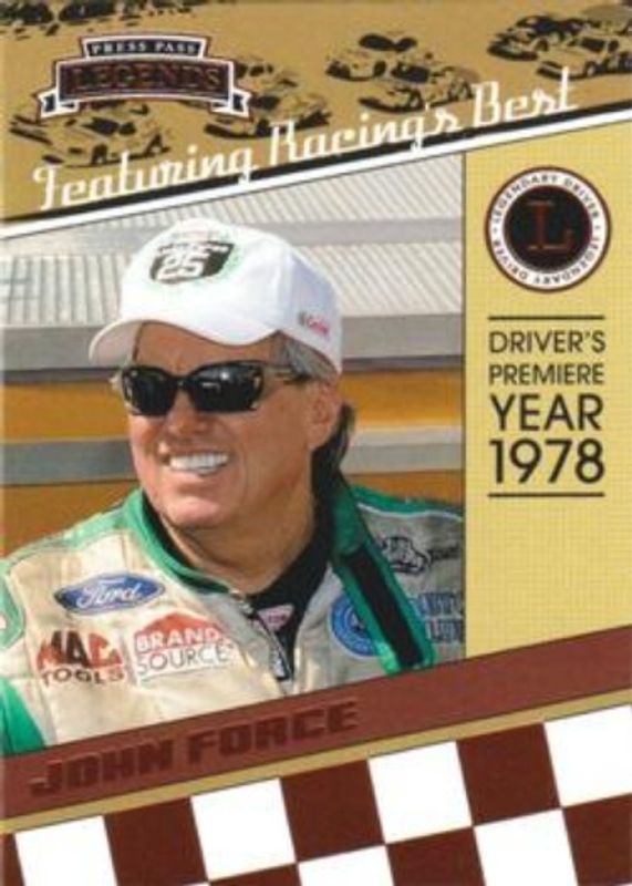 The John Force 2011 Press Pass Legends #12 Base card is 1 of 67 John Force's card variations in the 2011 Press Pass Legends set being tracked by Sports Card Investor, including League Leaders, Rated Rookie, Gold /250, League Leaders - Gold /250, and Rated Rookie - Gold /250.