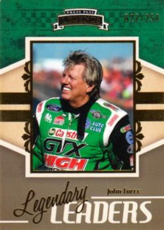 The John Force 2011 Press Pass Legends #65 League Leaders - Gold /250 card is 1 of 67 John Force's card variations in the 2011 Press Pass Legends set being tracked by Sports Card Investor, including Base, League Leaders, Rated Rookie, Gold /250, and Rated Rookie - Gold /250.