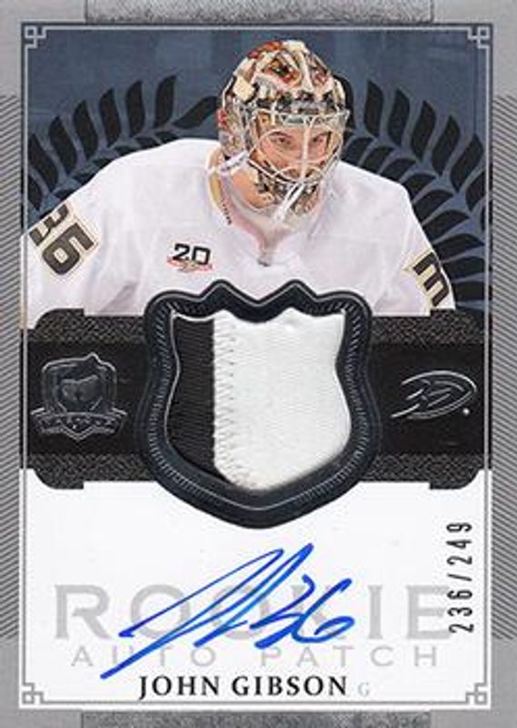 The John Gibson 2013 Upper Deck The Cup #109 Base /249 Rookie card is 1 of 24 John Gibson's card variations in the 2013 Upper Deck The Cup set being tracked by Sports Card Investor, including Gold Rookie Autographed Patch /58, Gold Rainbow /25, Gold /14, Black Laundry Tags /3, and Black Rookie Auto Tag /3.