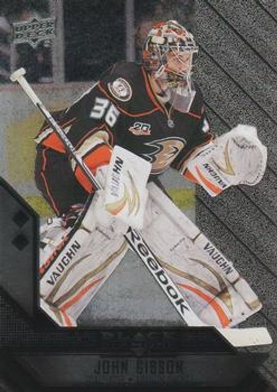 The John Gibson 2014 Upper Deck Black Diamond #150 Base card is 1 of 5 John Gibson's card variations in the 2014 Upper Deck Black Diamond set being tracked by Sports Card Investor, including Orange, Ruby /50, Sapphire /1, and Gemography.