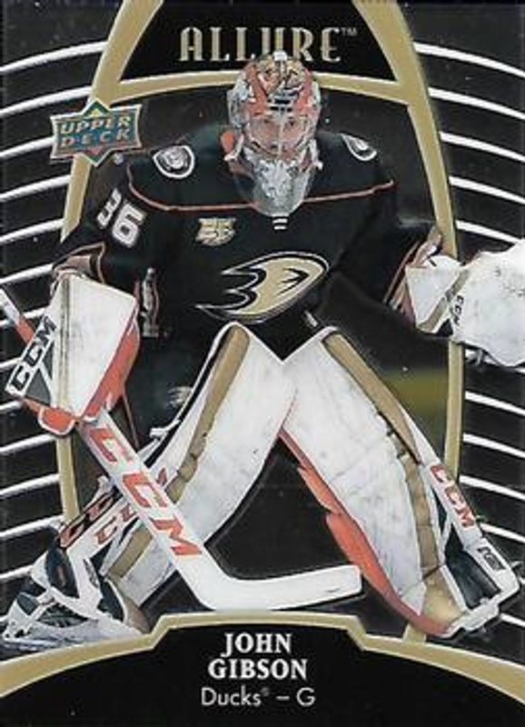 The John Gibson 2019 Upper Deck Allure #46 Base card is 1 of 25 John Gibson's card variations in the 2019 Upper Deck Allure set being tracked by Sports Card Investor, including Pewter, Red Rainbow, White Rainbow, Yellow Taxi, and Orange Slice /199.