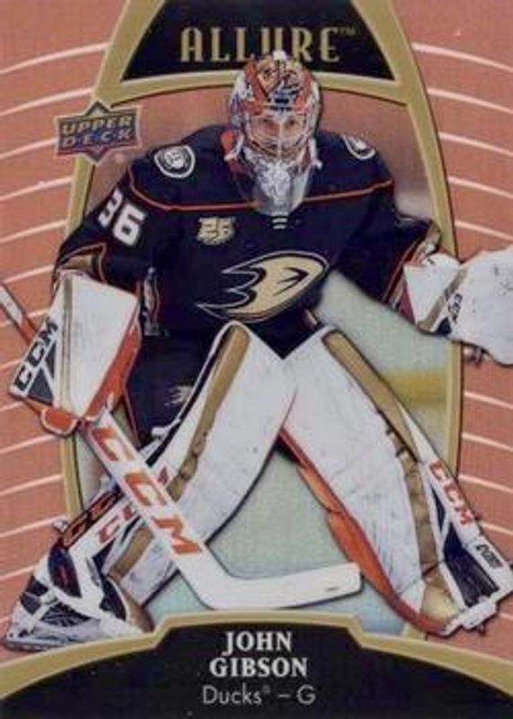 The John Gibson 2019 Upper Deck Allure #46 Sunset card is 1 of 25 John Gibson's card variations in the 2019 Upper Deck Allure set being tracked by Sports Card Investor, including Base, Pewter, Red Rainbow, White Rainbow, and Yellow Taxi.