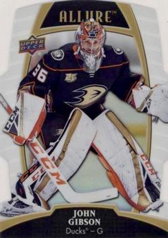 The John Gibson 2019 Upper Deck Allure #46 White Rainbow card is 1 of 25 John Gibson's card variations in the 2019 Upper Deck Allure set being tracked by Sports Card Investor, including Base, Pewter, Red Rainbow, Yellow Taxi, and Orange Slice /199.