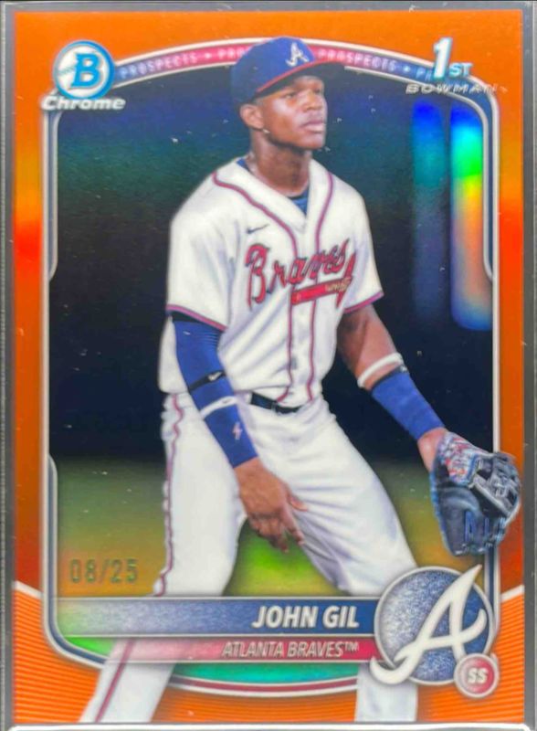 The John Gil 2025 Bowman Chrome #BCP-172 Prospects - Yellow Geometric Refractor /75 (1st) card in Raw condition has moved up $6.50 (+43.3%) in the last 30 days and was last sold for $21.50 .