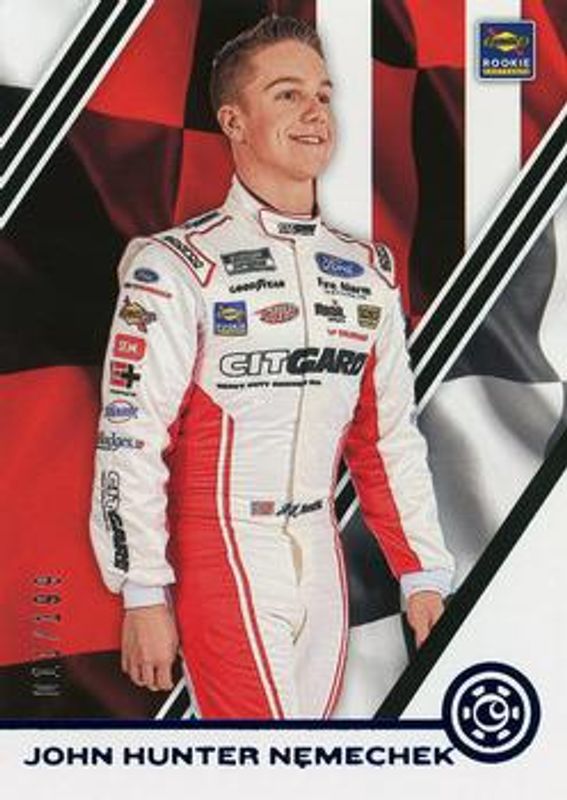 The John Hunter Nemechek 2020 Chronicles NASCAR #23 Blue /199 card is 1 of 86 John Hunter Nemechek's card variations in the 2020 Chronicles NASCAR set being tracked by Sports Card Investor, including Base, Red /99, Purple /25, Gold /10, and Black /1.