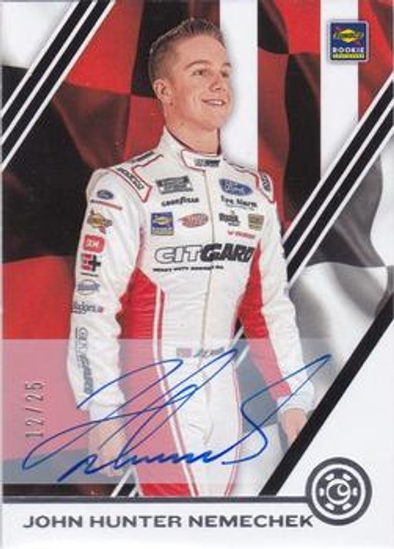 The John Hunter Nemechek 2020 Chronicles NASCAR #23 Chronicles Autographs /50 card is 1 of 86 John Hunter Nemechek's card variations in the 2020 Chronicles NASCAR set being tracked by Sports Card Investor, including Base, Blue /199, Red /99, Purple /25, and Gold /10.