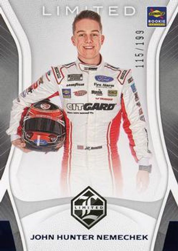 The John Hunter Nemechek 2020 Chronicles NASCAR #15 Limited Blue /199 card is 1 of 86 John Hunter Nemechek's card variations in the 2020 Chronicles NASCAR set being tracked by Sports Card Investor, including Base, Blue /199, Red /99, Purple /25, and Gold /10.