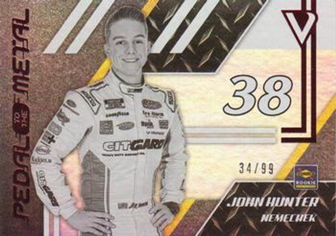 The John Hunter Nemechek 2020 Chronicles NASCAR #35 Pedal to the Metal Red /99 card is 1 of 86 John Hunter Nemechek's card variations in the 2020 Chronicles NASCAR set being tracked by Sports Card Investor, including Base, Blue /199, Red /99, Purple /25, and Gold /10.