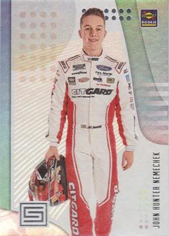 The John Hunter Nemechek 2020 Chronicles NASCAR #13 Status card is 1 of 86 John Hunter Nemechek's card variations in the 2020 Chronicles NASCAR set being tracked by Sports Card Investor, including Base, Blue /199, Red /99, Purple /25, and Gold /10.