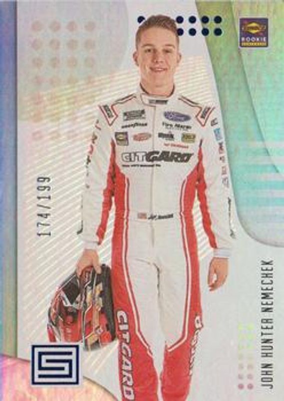 The John Hunter Nemechek 2020 Chronicles NASCAR #13 Status Blue /199 card is 1 of 86 John Hunter Nemechek's card variations in the 2020 Chronicles NASCAR set being tracked by Sports Card Investor, including Base, Blue /199, Red /99, Purple /25, and Gold /10.