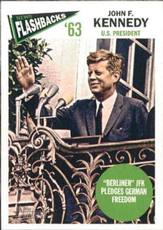 The John Kennedy 2012 Topps Heritage #NF-JKE News Flashbacks card is 1 of 4 John Kennedy's card variations in the 2012 Topps Heritage set being tracked by Sports Card Investor, including #NF-A News Flashbacks, #JFK1 The JFK Story, and #JFK2 The JFK Story.
