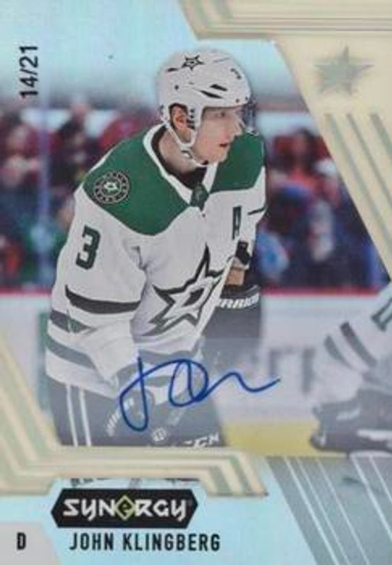 The John Klingberg 2020 Upper Deck Synergy #41 Base /21 card is 1 of 10 John Klingberg's card variations in the 2020 Upper Deck Synergy set being tracked by Sports Card Investor, including Red, Red Bounty, Purple /35, Exceptional Stars /749, and Synergy FX /749.