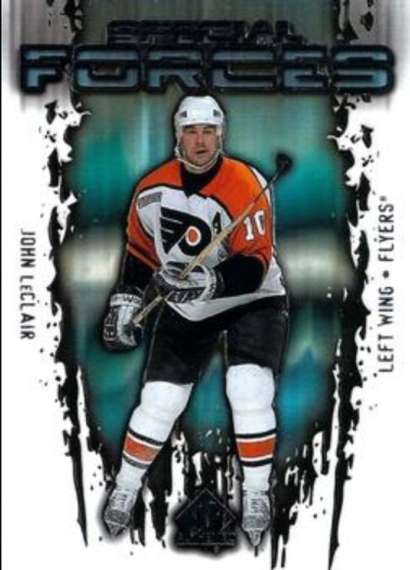 The John LeClair 2000 SP Authentic #SF5 Special Forces card is 1 of 12 John LeClair's card variations in the 2000 SP Authentic set being tracked by Sports Card Investor, including #64 Base /900, Autographed Replica Jersey Redemptions, #PS6 Parents' Scrapbook, #108 Buyback Autographs /154, and #112 Buyback Autographs /154.