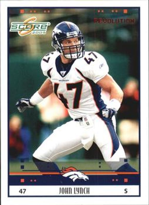 The John Lynch 2005 Score #87 Revolution /199 card is 1 of 6 John Lynch's card variations in the 2005 Score set being tracked by Sports Card Investor, including Base, Glossy, Scorecard /599, Adrenaline /399, and Final Score /17.