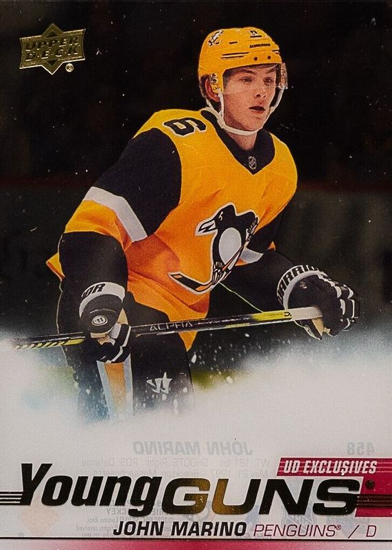 This card is 1 of 7 John Marino's card variations in the 2019 Upper Deck set being tracked by Sports Card Investor, including Young Guns Base, Young Guns - Clear Cut, Young Guns - Silver Foil, Young Guns - Speckled Rainbow Foil, and Young Guns - UD Exclusives /100.
