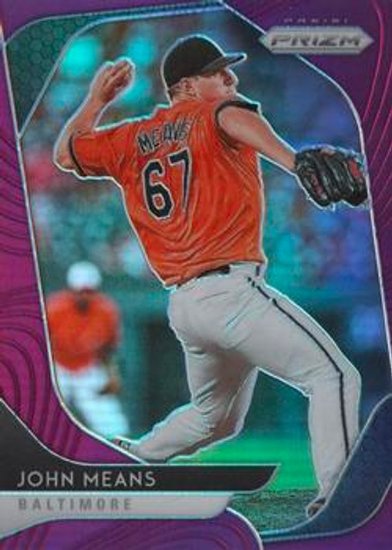 The John Means 2020 Prizm #16 Purple card is 1 of 37 John Means' card variations in the 2020 Prizm set being tracked by Sports Card Investor, including Base, Blue, Carolina Blue, Cosmic Haze, and Green.
