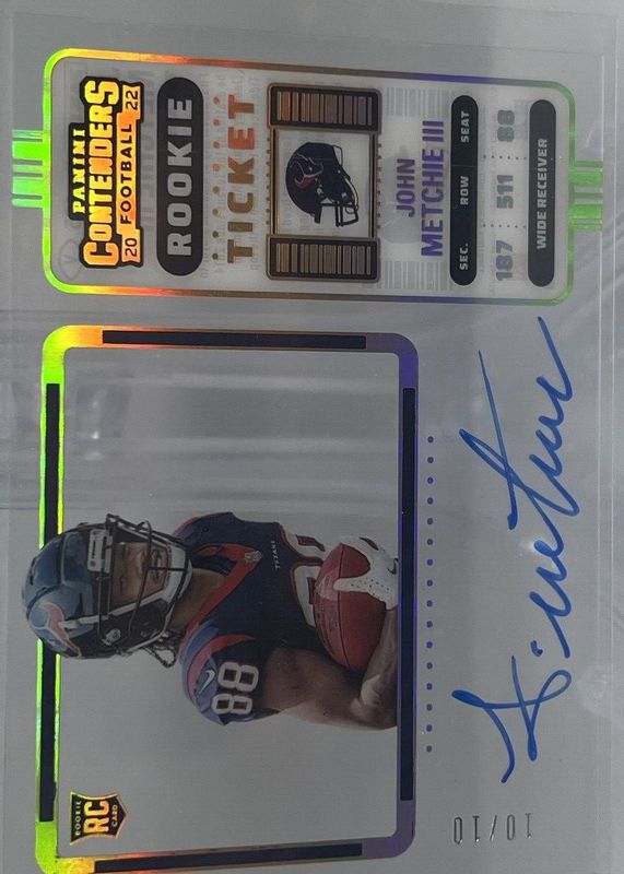 The John Metchie III 2022 Contenders #125 Rookie Ticket Auto Variation - Clear Ticket /10 card in Raw condition has not changed in price in the last 30 days and was last sold for $242.50 .