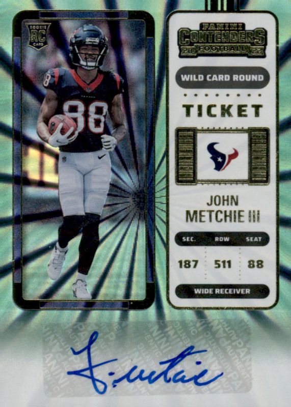This card is 1 of 28 John Metchie III's card variations in the 2022 Contenders set being tracked by Sports Card Investor, including Rookie Ticket Auto, Rookie Ticket Auto - Red Zone Ticket, Rookie Ticket Auto - Silver (/49), Rookie Ticket Auto - Ticket Stub (/88), and Rookie Ticket Auto - Playoff Ticket /99.