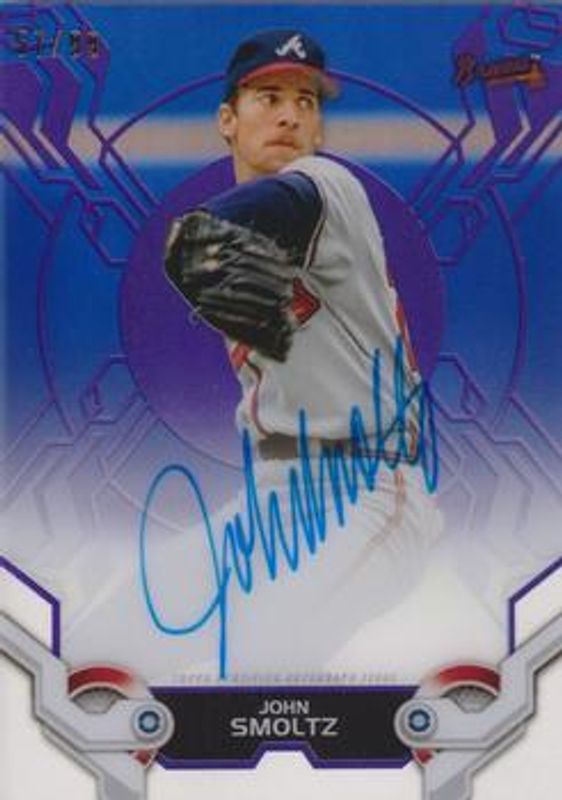 The John Smoltz 2019 Topps High Tek #HTA-JSM Autographs - Purple /99 card is 1 of 17 John Smoltz's card variations in the 2019 Topps High Tek set being tracked by Sports Card Investor, including Base, Blue, White, Green /150, and Purple /99.