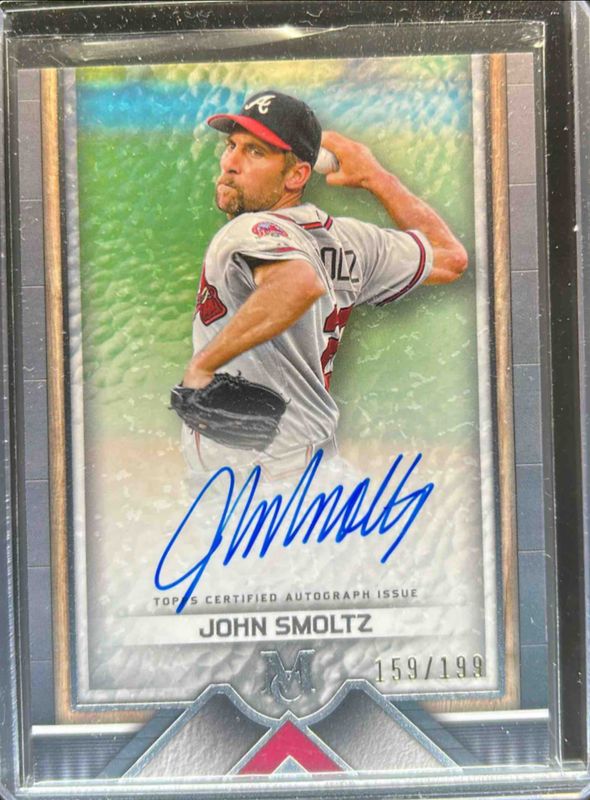 The John Smoltz 2023 Topps Museum Collection #AA-JSM Archival Autographs /299 card is 1 of 18 John Smoltz's card variations in the 2023 Topps Museum Collection set being tracked by Sports Card Investor, including Archival Autographs - Copper /50, Meaningful Materials Relics /50, Meaningful Materials Relics - Copper /35, Archival Autographs - Gold /25, and Meaningful Materials Relics - Gold /25.