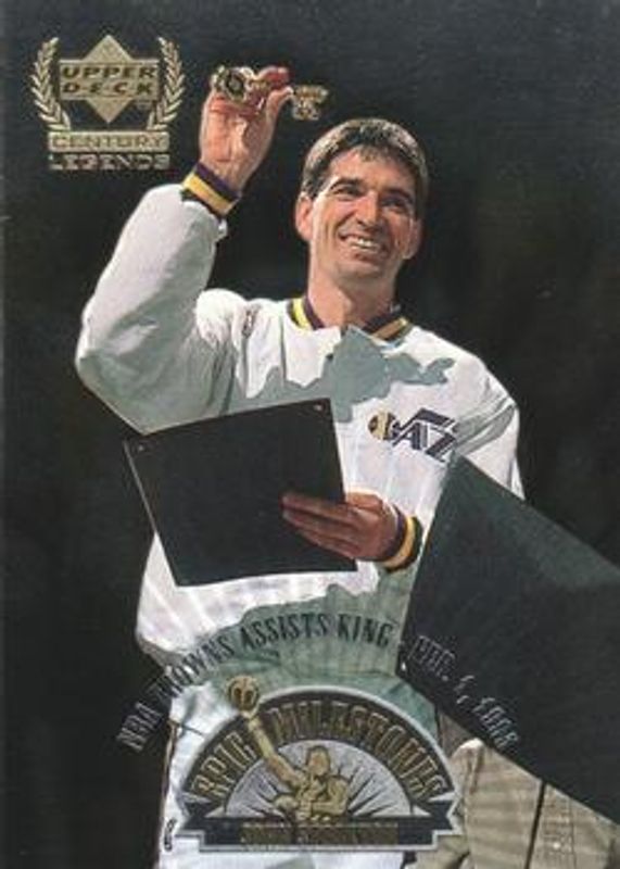 The John Stockton 1998 Upper Deck Century Legends #EM3 Epic Milestones card is 1 of 5 John Stockton's card variations in the 1998 Upper Deck Century Legends set being tracked by Sports Card Investor, including Base, Century Collection /100, All Century Team, and Jerseys of the Century /6.