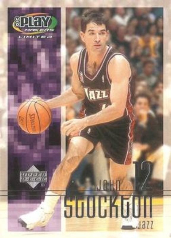 The John Stockton 2001 Upper Deck PlayMakers Limited #96 Base card is 1 of 4 John Stockton's card variations in the 2001 Upper Deck PlayMakers Limited set being tracked by Sports Card Investor, including Player's Club Game Jersey /350, Player's Club Warm Up /350, and Player's Club Warm Up Gold /250.