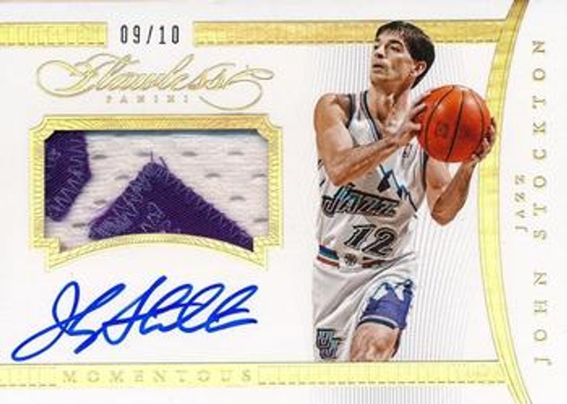 The John Stockton 2014 Flawless #MA-JS Momentous Autographed Memorabilia - Gold /10 card is 1 of 59 John Stockton's card variations in the 2014 Flawless set being tracked by Sports Card Investor, including #164 Base /20, #80 Base /20, #164 Ruby /15, #80 Ruby /15, and #164 Sapphire /10.