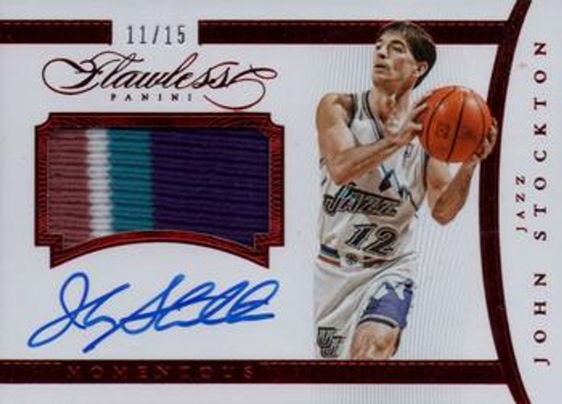 The John Stockton 2014 Flawless #MA-JS Momentous Autographed Memorabilia - Ruby /15 card is 1 of 59 John Stockton's card variations in the 2014 Flawless set being tracked by Sports Card Investor, including #164 Base /20, #80 Base /20, #164 Ruby /15, #80 Ruby /15, and #164 Sapphire /10.