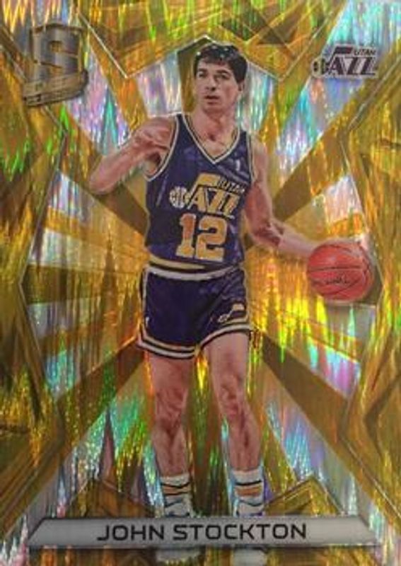 The John Stockton 2015 Spectra #6 Gold /10 card is 1 of 17 John Stockton's card variations in the 2015 Spectra set being tracked by Sports Card Investor, including Base /125, Spectacular Swatch Signatures /149, City Limits /(SSP), Franchise Fabrics /49, and Spectacular Swatch Signatures - Light Blue /49.