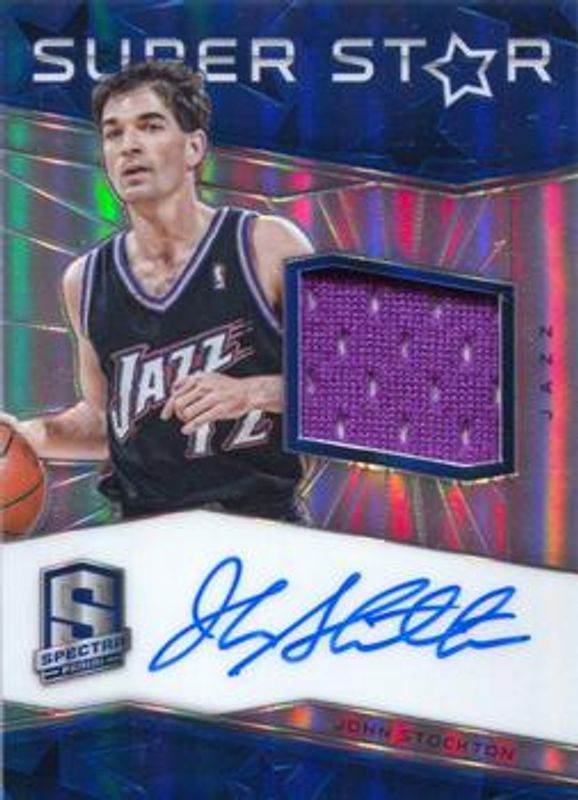 The John Stockton 2015 Spectra #SM-JS Superstar Materials Autographs /30 card is 1 of 17 John Stockton's card variations in the 2015 Spectra set being tracked by Sports Card Investor, including Base /125, Spectacular Swatch Signatures /149, City Limits /(SSP), Franchise Fabrics /49, and Spectacular Swatch Signatures - Light Blue /49.