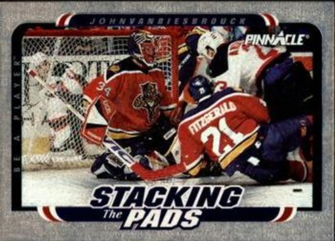The John Vanbiesbrouck 1996 Be A Player #4 Stacking the Pads card is 1 of 7 John Vanbiesbrouck's card variations in the 1996 Be A Player set being tracked by Sports Card Investor, including Link 2 History Autographs, Link 2 History, Link 2 History Autographs - Silver, Link 2 History - Enhanced Foil, and Link 2 History - Enhanced Foil Autographs.