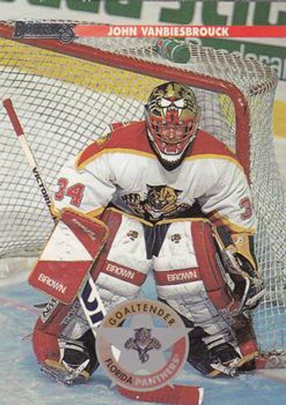 The John Vanbiesbrouck 1996 Donruss #187 Base card is 1 of 3 John Vanbiesbrouck's card variations in the 1996 Donruss set being tracked by Sports Card Investor, including Press Proofs, and Between The Pipes /4000.